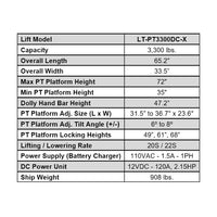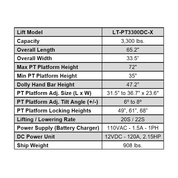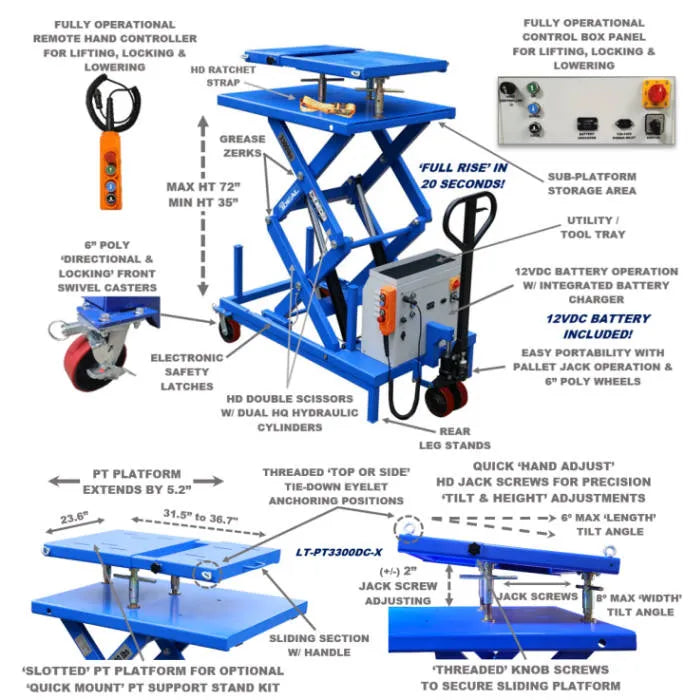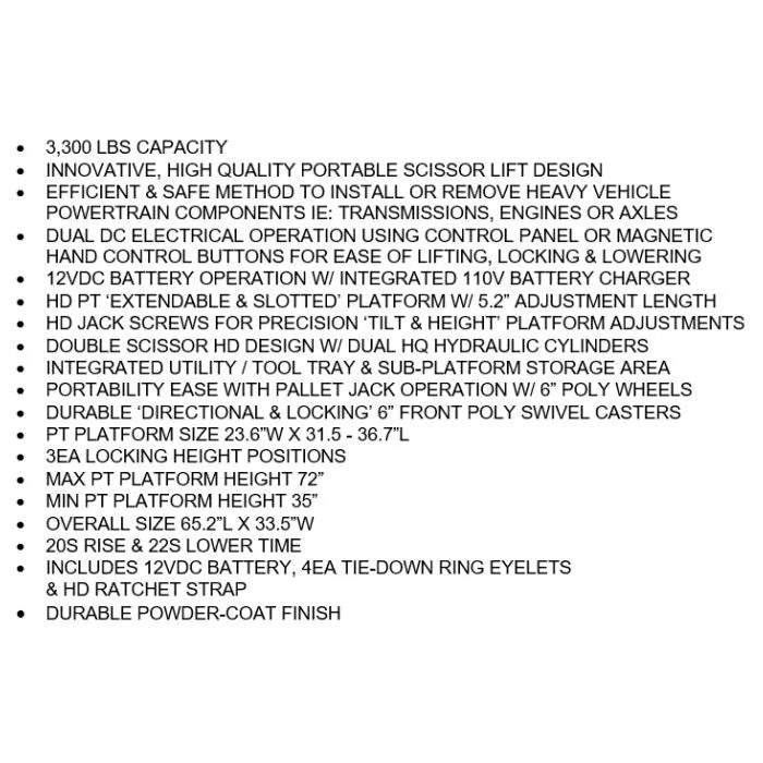 The iDEAL LT-PT2500AH-X is a 3,300 lbs. portable, high-rise commercial and industrial grade 12VDC battery powered electric-hydraulic lift table, incorporating a multi-adjustable powertrain platform primarily designed to assist with controlled lifting and lowering tasks to safely remove, replace or service heavy vehicle powertrain components such as engines, transmissions, drive-axle and transaxle assemblies, or other similar heavy components. The LT-PT3300DC-X comes standardly equipped with a durable powertrain platform that includes extendable length, tilt & height adjustments, while also incorporating a fully operational remote hand controller & control box panel buttons for dual operational control operations. Also included is a high quality deep-cycle 12VDC sealed battery, integrated battery charger and 12VDC auxiliary outlet port. In addition, the iDEAL Powertrain 3,300 lbs. lift table comes standard with a pallet jack dolly with poly casters, leg support stands, front locking swivel & directional poly casters, tool tray, double lift scissors, powerful DC electric motor, dual hydraulic cylinders, tie-down anchors, and heavy duty ratchet strap. Optional Accessories include a 'quick mount' PT Support Stand Kit & 12VDC LED Spot Light with magnetic base