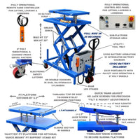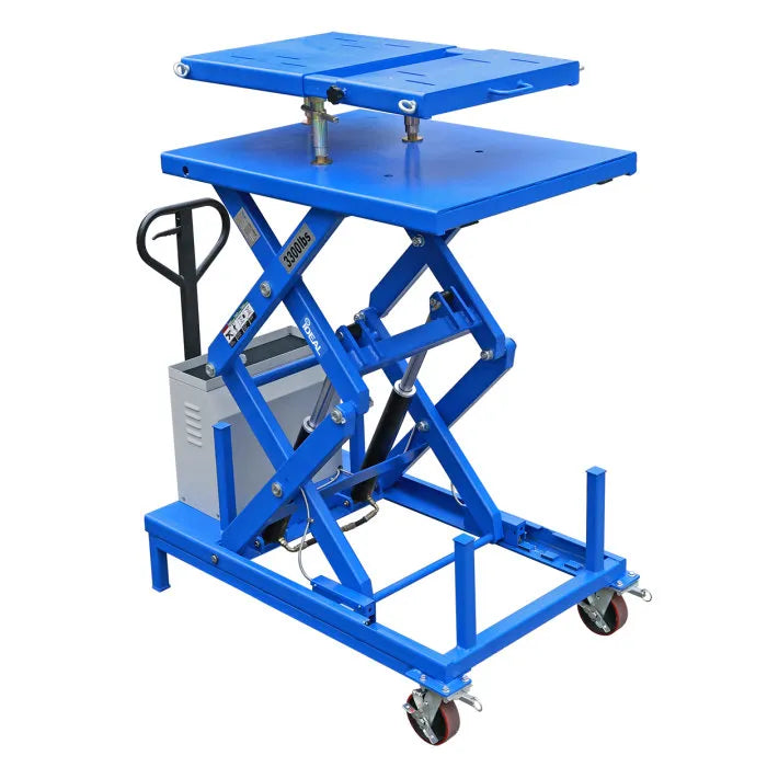 The iDEAL LT-PT2500AH-X is a 3,300 lbs. portable, high-rise commercial and industrial grade 12VDC battery powered electric-hydraulic lift table, incorporating a multi-adjustable powertrain platform primarily designed to assist with controlled lifting and lowering tasks to safely remove, replace or service heavy vehicle powertrain components such as engines, transmissions, drive-axle and transaxle assemblies, or other similar heavy components.