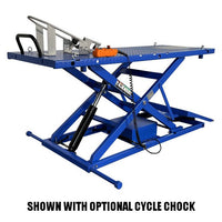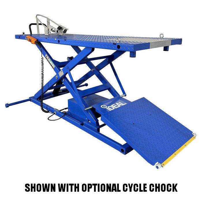 The iDEAL M-2200IEH-XR is a 2,200 lbs. lifting capacity Motorcycle Lift Table is designed to confidently lift the heaviest motorcycles using a frame mounted 110V electric hydraulic power unit to eliminate power unit stands and excess hose. New standard innovative retractable ramp design pulls ramp into the lift during lifting which saves space and eliminates the need to remove the ramp for service. The M-2200IEH-XR is operated using a hand held pendant for both raising and lowering operation eliminating the need to manually release locks. With 47" of lift height and extended length and width platform the M-2200IEH-XR is up to the task of lifting any motorcycle that requires lifting to properly service. Wheel Chock and Vise Sold Separately.