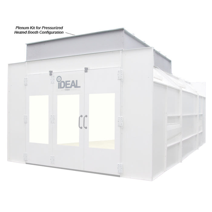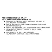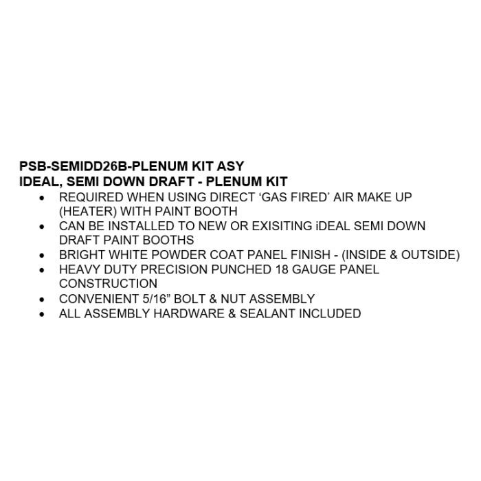iDEAL Semi Downdraft Paint Spray Booth Canopy Plenum Kit is required when when using direct 'gas fired' air makeup unit (paint booth heater) with semi downdraft paint booth. Canopy Plenum Kit can be installed to new or existing iDEAL Semi Downdraft Paint Booths. Features bright white powder coat finish inside and out, heavy-duty precision punched 18 gauge panel construction, convenient 5/16" nut and bolt assembly, and includes all assembly hardware and sealant.
