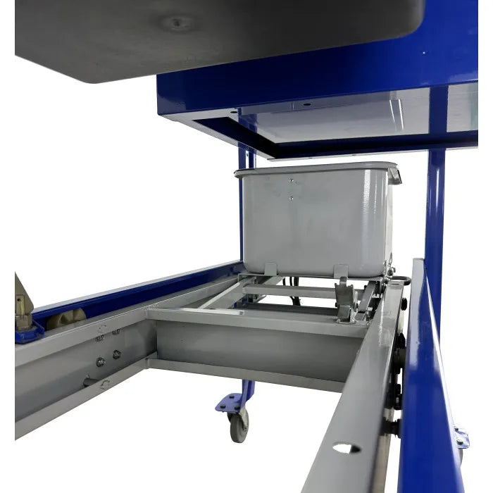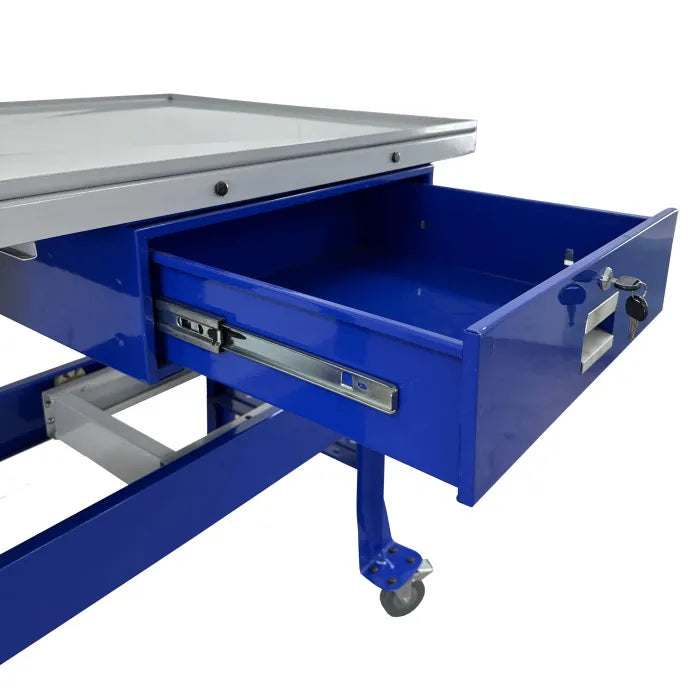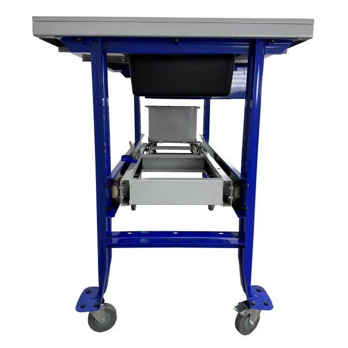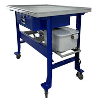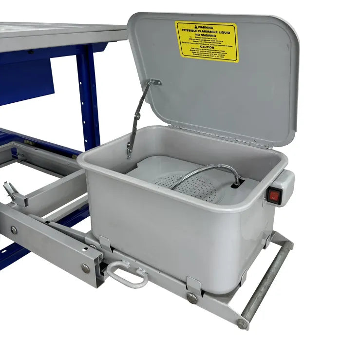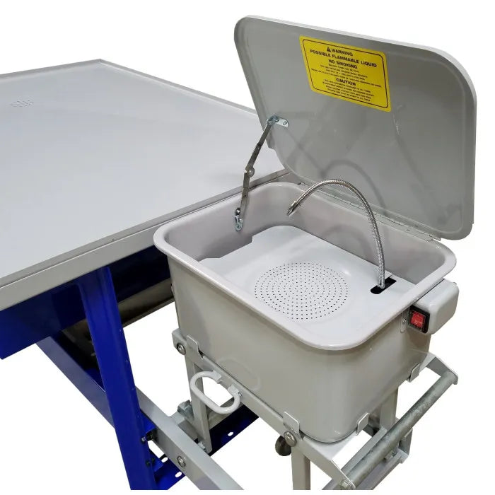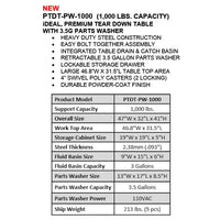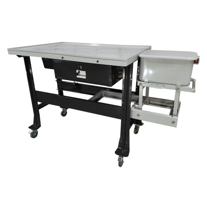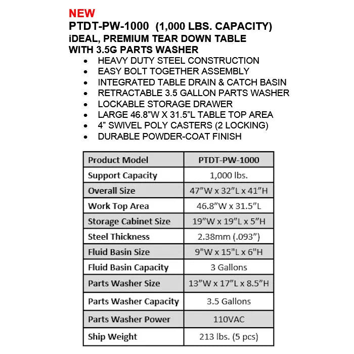 The iDEAL PTDT-PW-1000 Premium Tear Down Table & Parts Washer is a heavy-duty steel constructed shop tear down table with 1,000 lbs. support capacity. This shop tear down table has an easy bolt together assembly design and features a large 46.8" x 31.5" table top area, integrated table drain with catch basin, space-saving retractable 3.5 gallon parts washer, lockable storage drawer, and 4" swivel poly casters (2 locking, 2 fixed). The iDEAL PTDT-PW-1000 Premium Tear Down Table & Parts Washer is available in Blue or Black durable powder-coat finish.