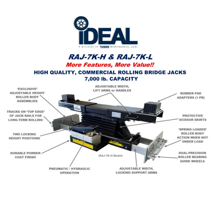 The iDEAL RAJ-7K-L Rolling Bridge Jack Low Mount is a high quality, automotive frame engaging 7,000 lbs. capacity, pneumatic / hydraulic operated, scissor-style rolling bridge jack, designed to be easily mounted on most four post or scissor lift's jack rails to expand the lift's service ability. Designed to lift either the front or rear wheels off the runways to provide 'wheels free' service for brake, suspension, tire repairs or general maintenance jobs. The iDEAL RAJ-7K-L Jack model includes 'exclusive' universal roller body brackets designed for either 'High Mount' or 'Low Mount' jack rail configurations for commercial four post or scissor lifts with integrated jack rails between the runways. The iDEAL RAJ-7K's exclusive design incorporates 'spring loaded' adjustable width & height roller body support brackets, allowing for the best fit to runways, while the dual-precision roller bearing guide wheels 'track' on the top edge & side of the jack rails, ensuring for smooth & safe long-term rolling operation. The RAJ-7K Jack also comes standard with a pair of rubber pad adaptors, protective scissor side skirts & high-quality pneumatic / hydraulic pump for premium, commercial grade rolling bridge jacks, all for an unmatched value!