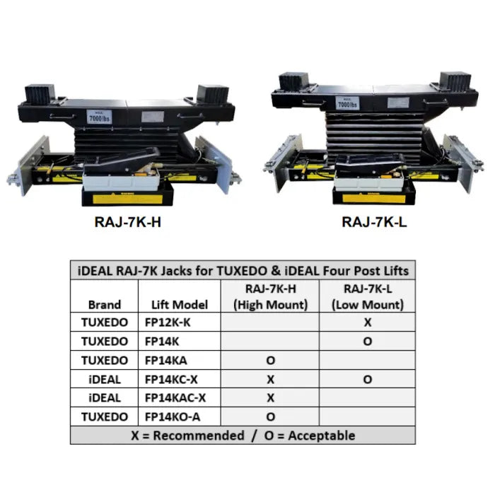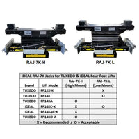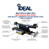 The iDEAL RAJ-7K-L Rolling Bridge Jack Low Mount is a high quality, automotive frame engaging 7,000 lbs. capacity, pneumatic / hydraulic operated, scissor-style rolling bridge jack, designed to be easily mounted on most four post or scissor lift's jack rails to expand the lift's service ability. Designed to lift either the front or rear wheels off the runways to provide 'wheels free' service for brake, suspension, tire repairs or general maintenance jobs. The iDEAL RAJ-7K-L Jack model includes 'exclusive' universal roller body brackets designed for either 'High Mount' or 'Low Mount' jack rail configurations for commercial four post or scissor lifts with integrated jack rails between the runways.