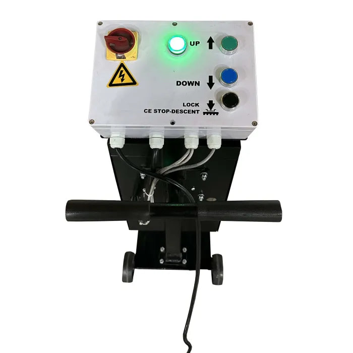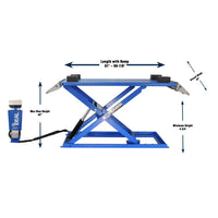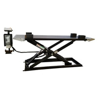 Featuring heavy-duty construction, durable powder coat finish, diamond plate platforms and load-bearing 'flip-up' hinged extensions. The lift has a small footprint providing less impact on your valuable work area. Smooth and quiet operation is provided by the 110V electric / hydraulic operation. The control panel allows for portable operation or as a fixed pedestal with it's anchoring option. The heavy-duty scissor lift has three locking positions and an electro-magnetic lock release.