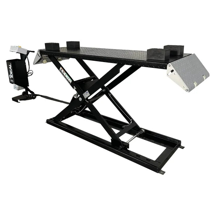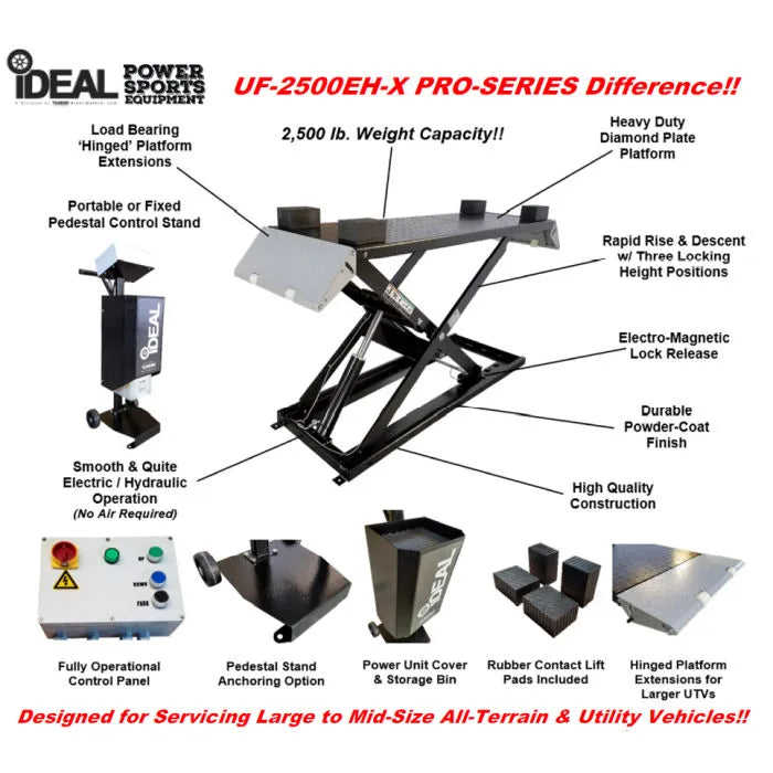 The iDEAL UF-2500EH-X Pro Series Frame Engaging UTV ATV Lift is able to lift the largest of UTVs with it's 2,500 lbs. capacity. The innovative 'frame-engaging' lift design allows for wheel and suspension service for the largest utility and all-terrain power sport vehicles. Featuring heavy-duty construction, durable powder coat finish, diamond plate platforms and load-bearing 'flip-up' hinged extensions. The lift has a small footprint providing less impact on your valuable work area. Smooth and quiet operation is provided by the 110V electric / hydraulic operation. The control panel allows for portable operation or as a fixed pedestal with it's anchoring option. The heavy-duty scissor lift has three locking positions and an electro-magnetic lock release.