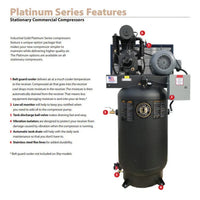 Industrial Gold Platinum Series Air Compressors come fully loaded with Belt Guard Cooler, Low Oil Monitor, Automatic Tank Drain, SMART Contact Controls, Vibration Isolation Pads, and Tank Discharge Ball Valve. These are premium features you won't find on most competing models.