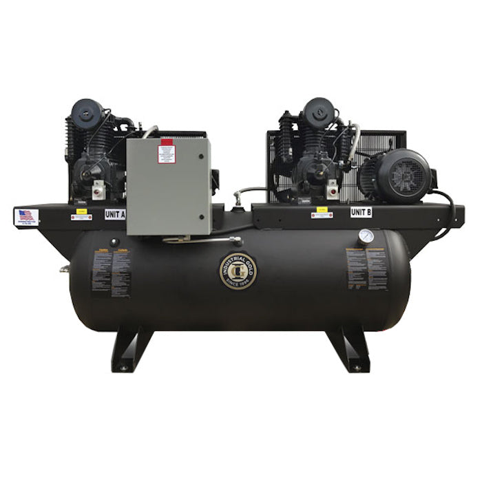 Industrial Gold duplex compressors are the ultimate in electrical efficiency. Designed for redundancy in all situations and built to deliver twice the power in the same amount of space as a typical compressors. Our duplex compressors deliver additional air when needed, are easy to service, maintain and operate. All units feature heavy-duty cast iron low-RPM pumps manufactured for durability and long life and heavy-duty components.