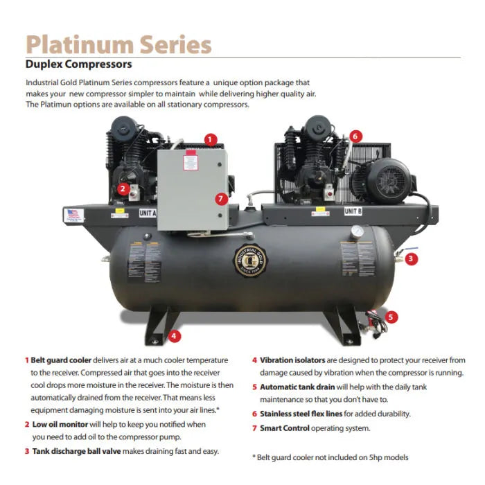 Industrial Gold Platinum Series Air Compressors come fully loaded with Belt Guard Cooler, Low Oil Monitor, Automatic Tank Drain, SMART Contact Controls, Vibration Isolation Pads, and Tank Discharge Ball Valve. These are premium features you won't find on most competing models.
