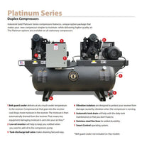 Industrial Gold duplex compressors are the ultimate in electrical efficiency. Designed for redundancy in all situations and built to deliver twice the power in the same amount of space as a typical compressors. Our duplex compressors deliver additional air when needed, are easy to service, maintain and operate. All units feature heavy-duty cast iron low-RPM pumps manufactured for durability and long life and heavy-duty components. If you want the finest compressors on earth, with all the premium features you would want. Then the Industrial Gold Platinum Series air compressors are for you. These elite commercial quality machines have features that you just won't get on typical air compressors.