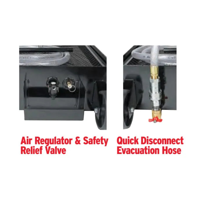 The 10′ evacuation hose includes a quick disconnect coupler making the evacuation process clean and easy.