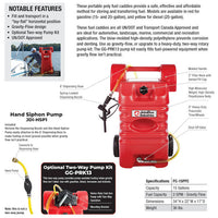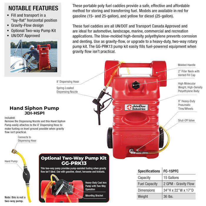 The JohnDow FC-15PFC 15-Gallon Portable Poly Gas Caddy provides a safe, effective and affordable method for storing and transferring fuel. This fuel caddy is UN/DOT and Transport Canada Approved and is ideal for automotive, landscape, marine, commercial and recreation applications. The blow-molded high-density polyethylene prevents corrosion and denting. Fuel dispenses using gravity flow, meaning the gas caddy MUST be at a higher level than the intended receptacle in order to dispense fuel (higher the gas caddy = better the flow). If gravity flow is not an option or feasible, you can upgrade to a heavy-duty, two-way rotary pump kit. The FC-PRK13 pump kit easily fills fuel-powered equipment when gravity flow isn't practical.