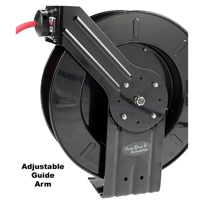 JohnDow Professional Retractable Hose Reels are designed for durable and dependable operation and dispensing of air, oil, antifreeze, and grease applications. Features include heavy-duty steel construction, corrosion resistant powder-coat finish, four-direction non-snag rollers, fully enclosed spring, full-flow swivel, and adjustable guide arm. Adjustable Guide Arm: Guide arm adjusts to nine different positions allowing for a variety of installation options.