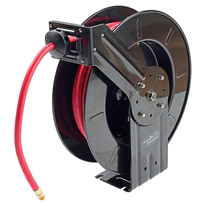 JohnDow Professional Retractable Hose Reels are designed for durable and dependable operation and dispensing of air, oil, antifreeze, and grease applications. Features include heavy-duty steel construction, corrosion resistant powder-coat finish, four-direction non-snag rollers, fully enclosed spring, full-flow swivel, and adjustable guide arm. Buy with confidence, JohnDow products are engineered and tested to provide the highest levels of quality, reliability and safety.