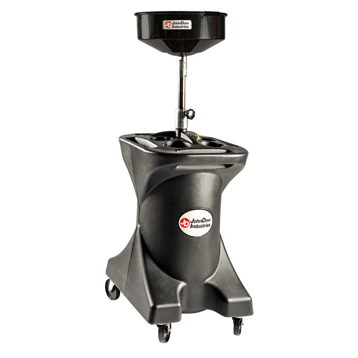 This heavy-duty self-evacuating oil drain is lightweight and durable. The virtually indestructible polyethylene construction prevents accidental damage to vehicles. JohnDow Model JDI-27DC Oil drain. If you were going to design an oil drain yourself, this would be it. It's got everything you need in one large, handy unit. It has the JohnDow Auto Check feature that will make oil gushers a thing of the past. If you want to empty it, just hook up your shop air to it and the rest is effortless. The 6 foot long discharge hose has a no drip spout to prevent messes in your shop and the funnel is adjustable from 45" up to 70". With the large 27 gallon capacity, you don't have to worry about draining it out all the time. 16" funnel is steel and holds up much better than some of those flimsy plastic funnels, plus the funnel has a mess steel screen so if you accidently drop the drain pan lug, you won't lose it down in the drum. The top of the unit has adequate storage for oil filters and wrenches so you never have to guess where you put them down again. This thing has everything a serious garage needs to be up and running.