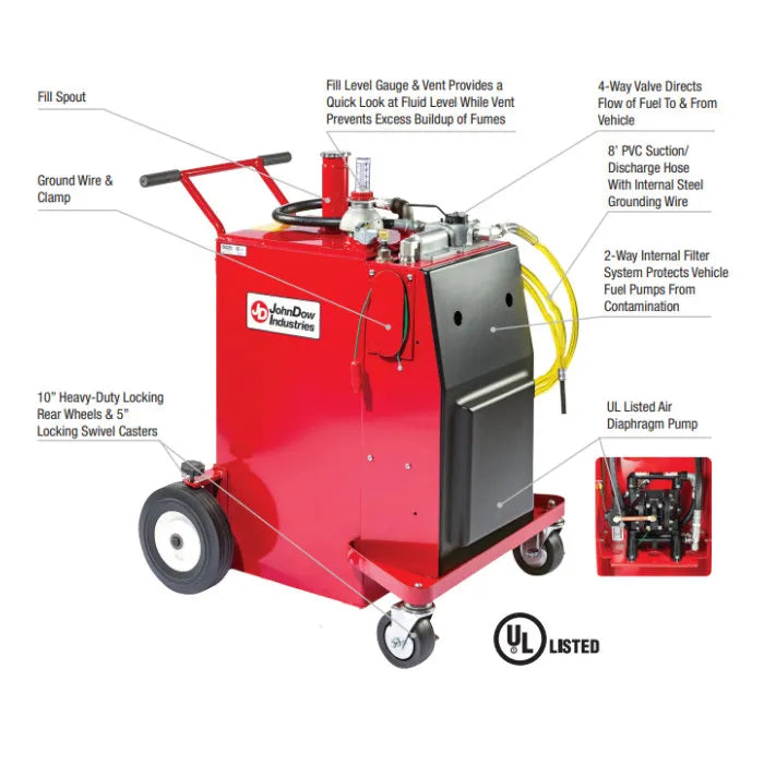 The JohnDow PRO30 Steel Gas Caddy is designed for the professional automotive technician, these cart-style UL Listed steel diesel caddies are rigorously tested for leakage, rupture, stability, abuse and endurance. The easy-to-move caddy is also OSHA compliant with all safety guidelines for gas or diesel handling and comes in two air operated pump options - gas (red) or diesel (yellow). These professional series of fuel caddies are one of only a very select few that are UL listed. OSHA requires gas caddies to be UL listed these days. If yours isn't, you risk potential liability if something catastrophic happens. This unit is designed for professional mechanics and auto shops. Cart is easy to roll around the garage and out to the lot. Most importantly, it complies with OSHA requirements.