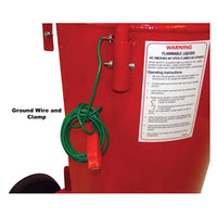 The ground wire and clamp mounted on the rear handle bracket make for easy, safe grounding access. Always attach the ground wire to the vehicle before transferring fuel.