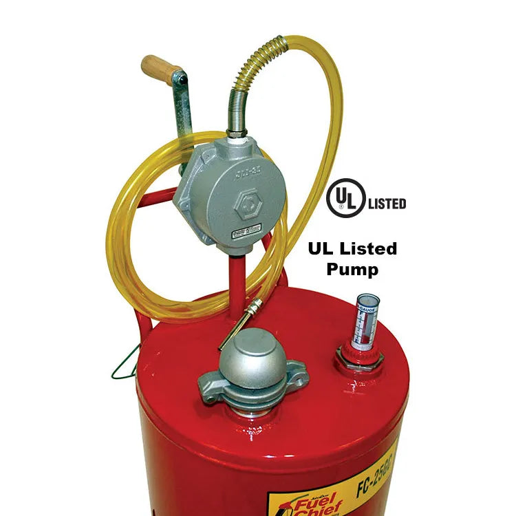 This heavy-duty, UL Listed cast iron rotary pump with carbon vanes and Viton seals offers a two-way operation for siphoning or dispensing fuel. One gallon is delivered for every 12 revolutions on the pump handle.