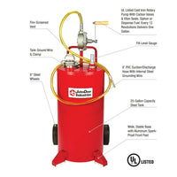 The JohnDow FC-25GC Steel Gas Caddy 25-Gallon is designed for the professional automotive service facility, this UL Listed steel gas caddy is rigorously tested for leakage, rupture, stability, abuse and endurance. It is also OSHA compliant with all safety guidelines for gas handling. Featuring UL Listed cast iron rotary pump with carbon vanes, 25-gallon capacity heavy-duty steel tank, wide stable base with aluminum spark-proof front feet, 8" steel wheels, tank ground wire and clamp, fire-screened vent, fill level gauge, and 8' PVC suction/discharge hose with internal steel grounding wire.