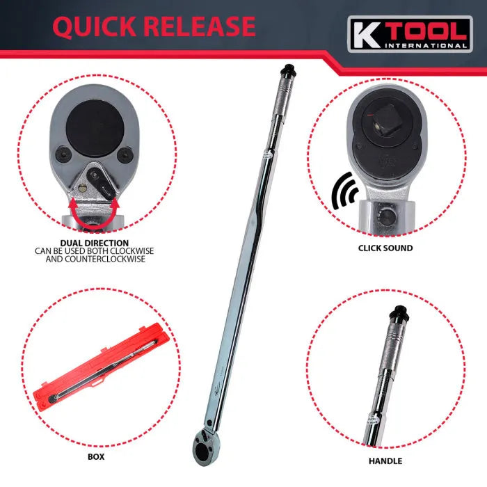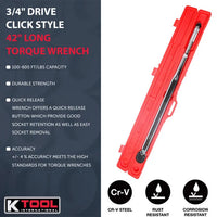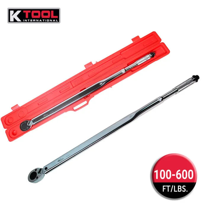 The K Tool KTI72175 3/4" Drive Click Torque Wrench is one of the best on the market for shop owners or simply using at home. The durability, longevity, and reliability of this torque wrench saves both time and money. Key features and benefits include the 100-600 ft/pound range, EZ-turn torque adjustment, and push-button release for quick socket changes. Torque wrench clicks when proper torque is achieved to prevent exceeding the preset torque level. Simply adjust the torque specification on the wrench by releasing the red knob and turning the handle of the torque wrench while holding the shaft of the torque wrench. Manufactured for accuracy, strength and reliability giving you the peace of mind you need to make an informed purchase. Since 1984, K Tool International leads the market by ensuring that our products are rugged, reliable, and reasonably priced for all users.