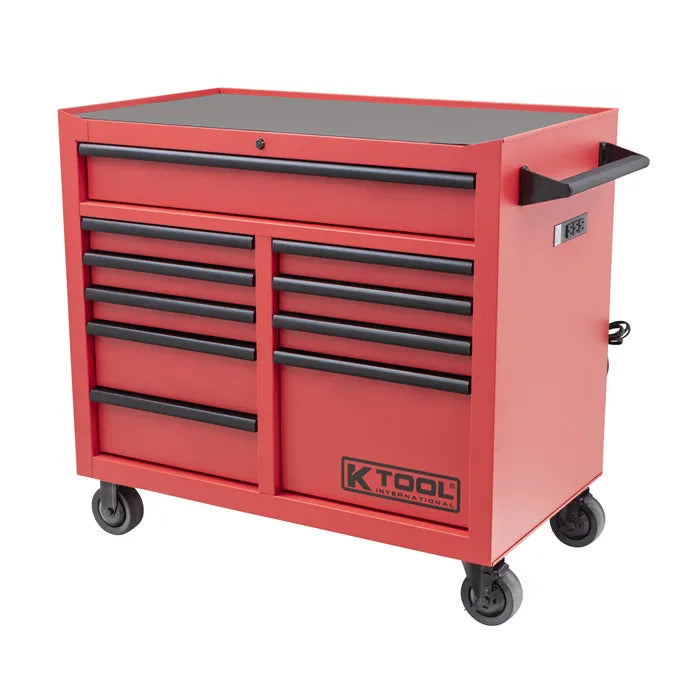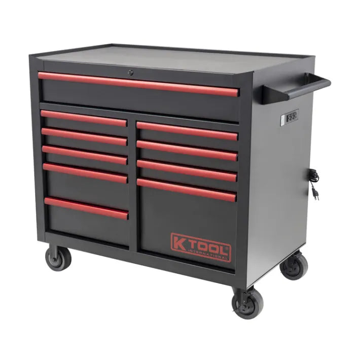 The K Tool KTI75132 41" Premium 10-Drawer Rolling Cabinet features cold rolled steel plate construction, 1,000 lbs. load capacity, durable powder coat finish, locking full extension drawers with ball bearing slides, anodized aluminum drawer pulls, push handle, integrated UL power strip, and heavy-duty 5" x 2" swivel casters. EVA drawer liners are included and rolling cabinet ships fully assembled. Available in 2 bold colors: Matte Black with Red Drawer Pulls and Matte Red with Black Drawer Pulls. Making a tool storage decision can be difficult. The technicians tool storage selection needs to represent durability, functionality, and versatility when choosing the right product. From entry level job specific carts to multiple drawer triple bay tools boxes, feel confident that the K-Tool International tool storage products has you covered. All K-Tool International product are made from the highest quality material and rigorously tested to withstand the toughest shop environments.