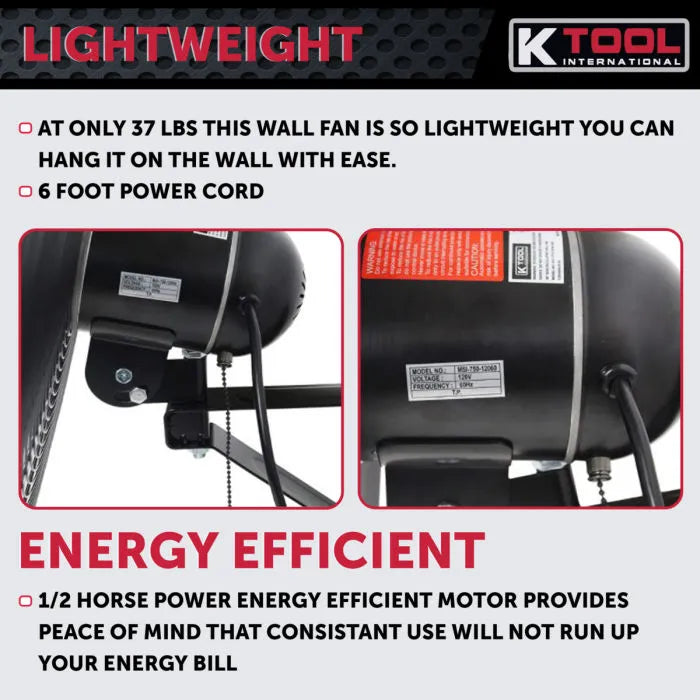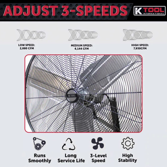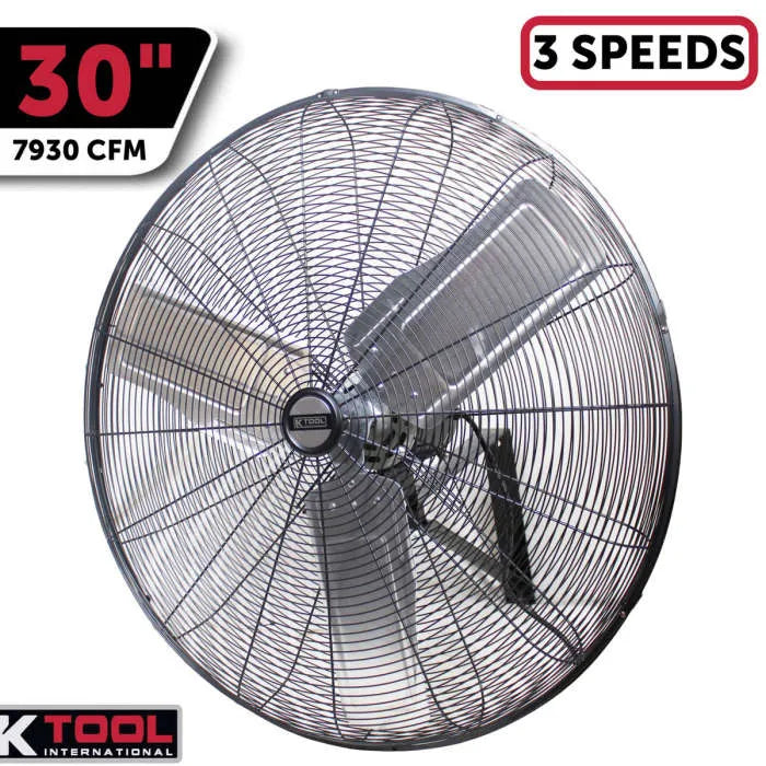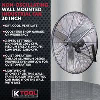 The K Tool KTI77732 30" Oscillating Wall Mount Fan provides powerful air delivery, making it ideal for residential, commercial, or industrial applications. Oscillating function will evenly cool your shop, garage, or workspace. This high-velocity energy efficient fan runs smoothly and quietly while providing 3 levels of air flow. At only 37 lbs. this light-weight fan has pre-punched holes in the mounting bracket for easy installation in your shop or garage.