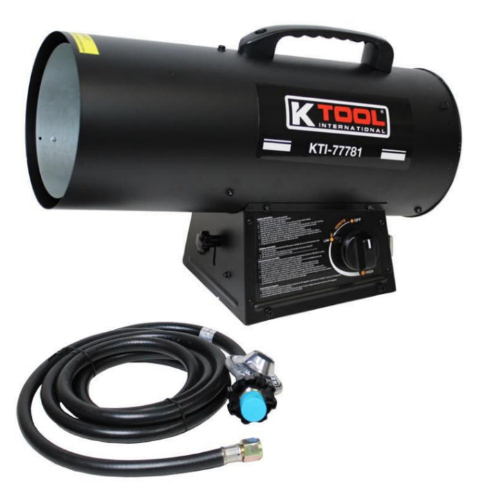 The K Tool KTI77781 40-60,000 BTU Forced Air Propane Heater's lightweight and compact design can be used in a garage or on the worksite. The 40,000-60,000 BTU forced air propane heater is made with heavy-duty quality materials to withstand any worksite. Powder-coated long-lasting shell protects an efficient combustion odorless element that produces no fumes. Equipped with safety shutdown on gas/flame/fan failure and overheat protection.Features & Specs