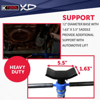 The K Tool KTIXD61077 3/4 Ton Under Hoist Jack Stand with Pedal is designed to support under car components. Supporting range is from 53-1/2" to 80". Acme threaded screw for self-locking positioning and foot pedal to raise screw another 1.25" under 400 lbs. of load. Bearing mounted spin handle for easy raising and lowering of screw. 12" diameter base with 1.63" x 5.5" saddle provide additional support. Complies with ASME PASE/2014 Safety Standards. Under hoist stands work by holding up your work from the bottom. They are thin and easily portable, allowing you to set them up when you need them and store them anywhere when you don't.