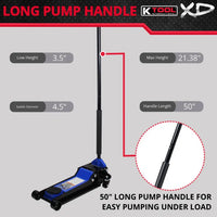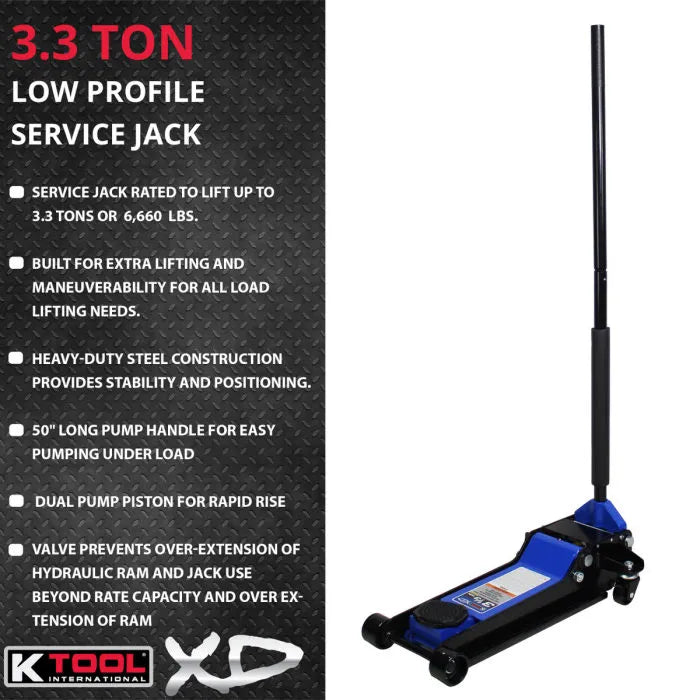 The K Tool KTIXD63133 Heavy-Duty Low-Profile 3.33 Ton Floor Jack is designed for low ground clearance vehicles, featuring a lift range from 3.5" to 21.375". The 50" long pump handle accommodates easy pumping under load. The dual pump piston power unit raises the saddle to the maximum height in 8 full incremental pump strokes with no load. Load-limiting and bypass valves prevent using the jack beyond it's rated capacity and over-extension of the ram.