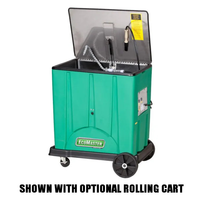 The KleenTec EcoMaster 6000 from Fountain Industries is a water based parts washer with 45 gallon capacity, flexible spigot, and a flow through brush for effective cleaning, and a soak area to allow parts to soak prior to cleaning. EM6000 can be converted to a rolling brake wash unit with optional 61332 rolling cart. These are made to order at the factory.