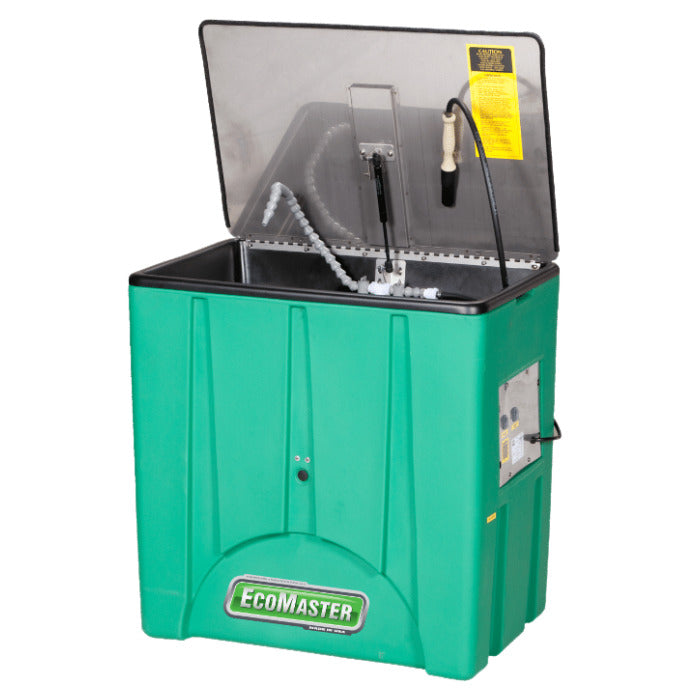The KleenTec EcoMaster 6000 from Fountain Industries is a water based parts washer with 45 gallon capacity, flexible spigot, and a flow through brush for effective cleaning, and a soak area to allow parts to soak prior to cleaning. EM6000 can be converted to a rolling brake wash unit with optional 61332 rolling cart.