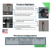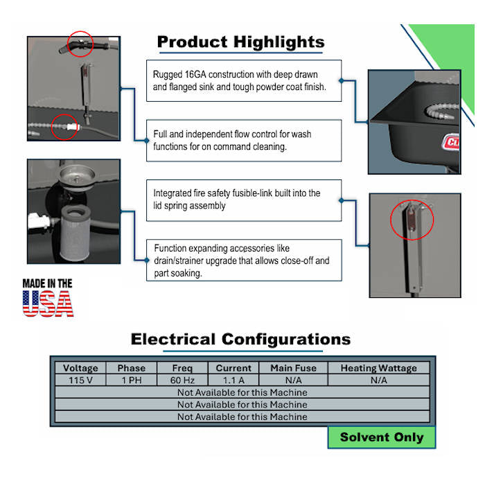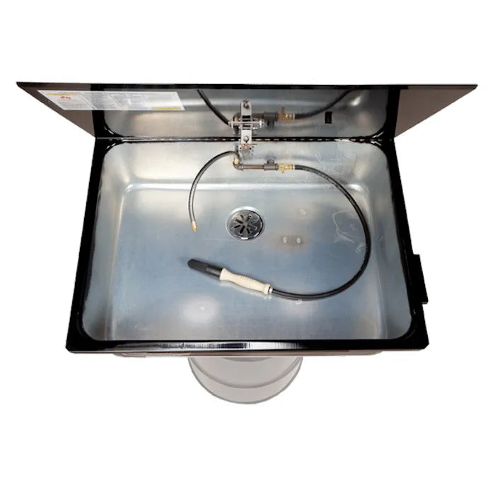 This solvent based model circulates the solvent continuously, including through it's convenient stay put flexible steel spigot. Spigot also has a handy feature - you can adjust the control of the flow of the detergent. Crank it up for maximum cleaning capabilities on those tough jobs, and throttle it down for energy savings. Unit also features fusible link that will close the lid / cover automatically in the event of fire. Integrated drain valve allows for easy cleaning of unit, and the filtration is a premium feature that will extend the life of your cleaning agent, thus saving you money in the long run. First, there is a barrier filter to stop any particulates or heavy sludge from entering the pump intake valve. Add the optional cartridge filter assembly to really crank up the savings. And the less frequently you need to change out your detergent, the more money you save both on new detergent, and disposal fees. You can also expect rugged construction throughout - no flimsy gauge steel sheet metal here. We're talking 14 and 16 gauge reinforced throughout unit. Powder coated finish - not just painted. Exposed edges are rolled for safety and strength. Corners are welded and smooth finished.