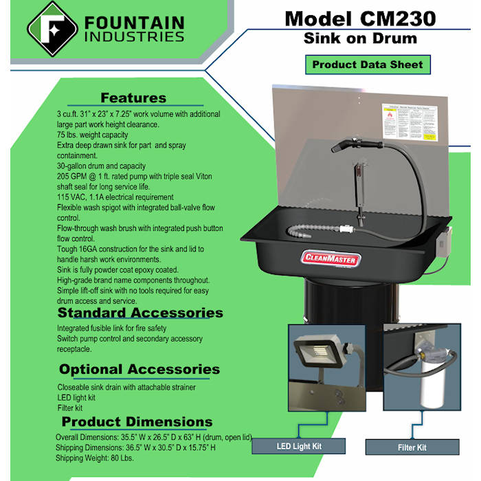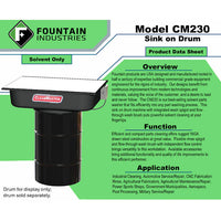 Fountain products are USA designed and manufactured rooted in half a century of expertise building commercial grade equipment engineered for the rigors of industry. Our designs benefit from continuous improvement from modern technologies and materials, valuing the voice of the customer, and a desire to lead and never follow. The CM230 is our best-selling solvent parts washer that fits efficiently into any part washing process. This sink on drum machine with integrated wash spigot and flow-through wash brush puts powerful solvent cleaning at your fingertips.