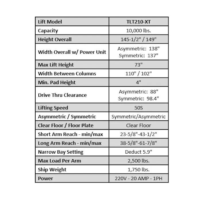 The Launch TLT210-XT does it all. This hoist is a full featured, full service lift that is jam packed with all the popular features you'd find on much more expensive two post lifts out there. Have a slightly shorter ceiling? No problem, you can set this model up at two different column heights. Is your bay wide, or narrow? Great. You can set this model up in a wide, or a narrow configuration. So it can handle smaller sports cars all the way up to full size pick up trucks and SUV's. Do you want to set it up symmetric, or asymmetric with rotated columns? No need to choose now. You can set it up either way when you get it. Triple telescoping arms in the front allow for greater ability to reach various vehicle frame jacking points. Spin up adjustable screw pads allow for infinite adjustability, and pair up with a stackable height extension adapter as well. Pair all these features up a USA made power unit, and you just can't beat this deal.