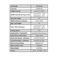 The Launch Tech USA TLT210-XT Two Post Auto Lift is a direct drive, multi-purpose, ALI certified 10,000 lbs. professional grade two post, asymmetric clear floor lift with adjustable width and height. Adjustability, quality manufacturing and design coupled with unsurpassed customer support. The TLT210-XT may be installed in a standard or rotated column configuration to accommodate the smallest cars to the largest SUVs and trucks. This ALI and ETL Certified lift has it ALL and comes with a one (1) year limited warranty.