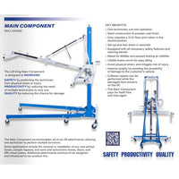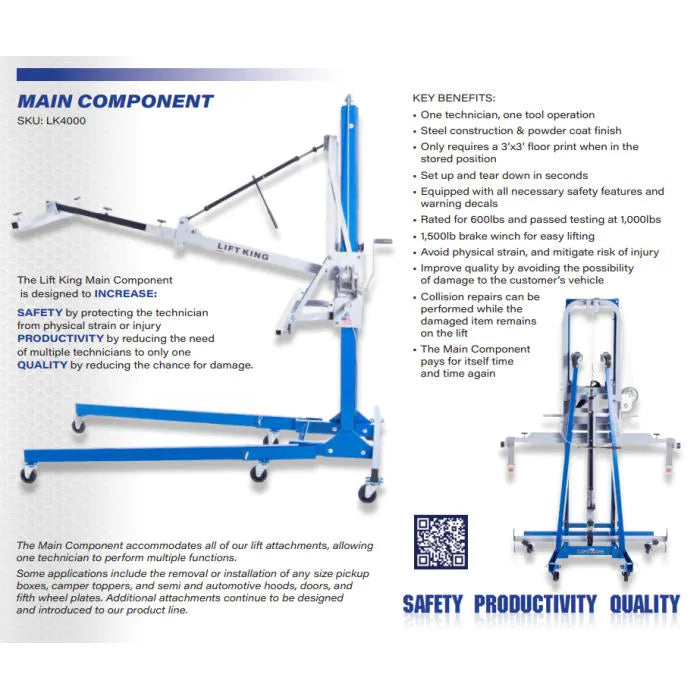 The Lift King LK4000 Main Component accommodates all of our attachments, allowing one technician to perform multiple functions. Some applications include the removal or installation of any size pickup boxes, truck and camper toppers, semi and automotive hoods, doors, bumpers, and fifth wheel plates. Additional attachments continue to be designed and introduced to our product line.The Lift King LK4000 Main Component is designed to INCREASE: