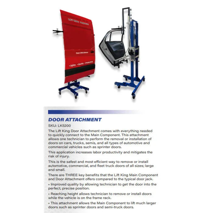 The Lift King LK5200 Door Attachment comes with everything needed to quickly connect to the Main Component. This attachment allows one technician to perform the removal or installation of doors on cars, trucks, semis, and all types of automotive and commercial vehicles such as sprinter doors.Lift King LK4000 Main Component Not Included