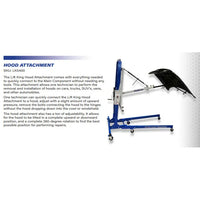The Lift King LK5400 Hood Attachment comes with everything needed to quickly connect to the Main Component without needing any tools. This attachment allows one technician to perform the removal and installation of hoods on cars, trucks, SUVs, vans, and other automobiles.