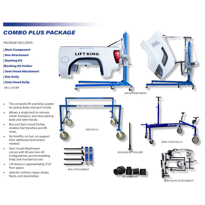 The Lift King Light & Heavy Duty Combo Plus Package comes with everything included in the Lift King Light & Heavy Duty Combo Package Plus the Bushing Kit Holder, Box Dolly, Semi Hood Attachment, & Semi Hood Dolly.