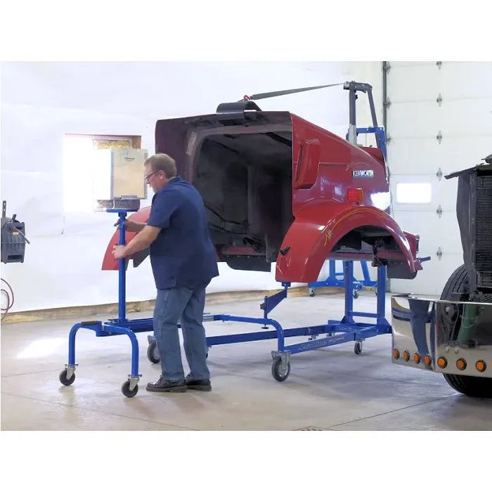 After removal, the semi hood can be lowered onto the Lift King Semi Hood Dolly that is included in this package. By utilizing the included Semi Hood Dolly, other technicians can perform removals and installations by keeping the lift free at all times.