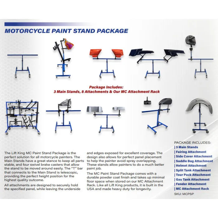 The Lift King MCPSP Motorcycle Paint Stand Package is inexpensive and simple to use. It is built durable and designed for longevity. Each stand has 3" swivel brake casters that make moving parts an easier task. The upper adjustment bar is telescopic, allowing the painter to raise or lower the parts into the perfect position for the highest quality outcome. This package is an excellent addition for shops that do any custom, paint, or air brush work on motorcycle parts. Package includes all the attachments needed to motorcycle parts for painting.Package Contents: (3) Motorcycle Paint Stands, Gas Tank Attachment, Split Tank Attachment, Saddle Bag Attachment, Fender Attachment, Tour Pack Attachment, Side Cover Attachment, Helmet Attachment, Fairing Attachment, and Motorcycle Attachment Rack