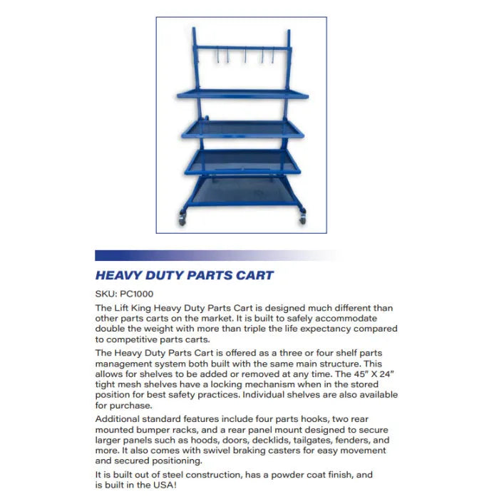 The Lift King Heavy Duty Parts Cart is designed much different than all other parts carts on the market. It is built to safely accommodate double the weight with more than triple the life expectancy compared to competitive parts carts. The PC1000 includes (4) parts hooks, (2) rear mounted bumper racks, and a rear panel mount designed to secure larger panels such as hoods, doors, decklids, tailgates, fenders, and more. It also comes with (4) swivel braking casters for easy movement and secured positioning.The PC1000 is offered as a 3 or 4 shelf parts management system both built with the same main structure. This allows for shelves to be added or subtracted at any time. The 45" W X 24" D tight mesh shelves have a locking mechanism when in the stored position for best safety practices. Individual shelves are available for purchase.