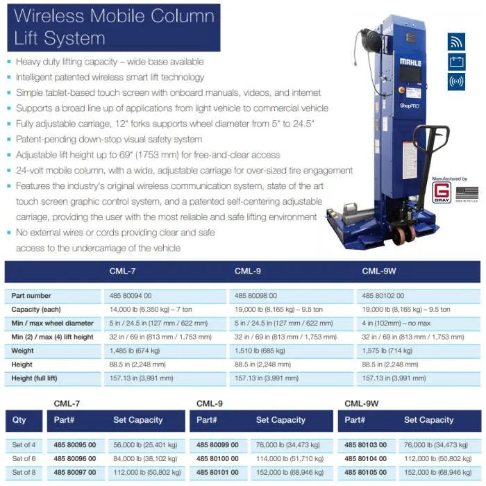The patented Gray Wireless Portable Lift System improves a shop's safety, productivity and flexibility. The wireless lift system family will lift a wide variety of vehicles allowing technicians to safely and efficiently complete preventative maintenance tasks prior to major component repair. - Heavy Duty Lifting Capacity. 14,000 lbs. (CML-7)