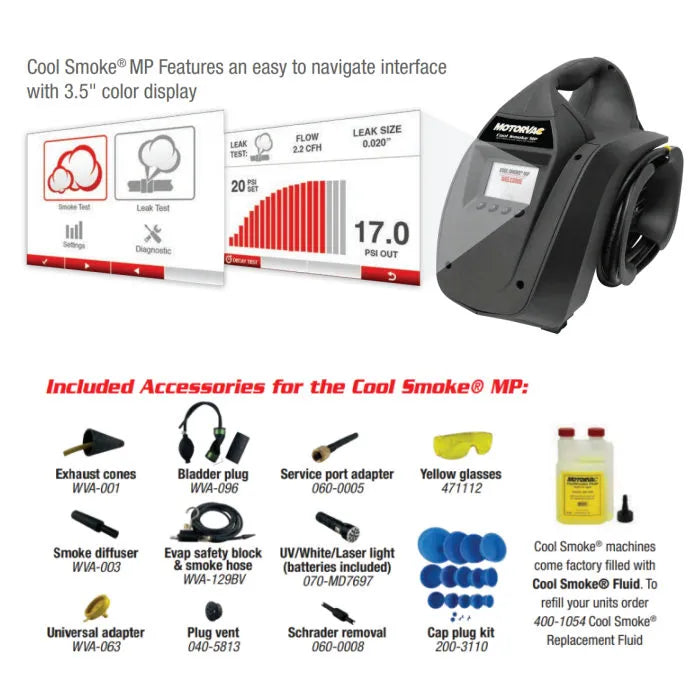 The MotorVac CoolSmoke MP Multi-Pressure Leak Diagnostic System model 500-0175 is the next generation of diagnostic leak detection that delivers market-leading reliability with patented "no heat" safety proven Cool Smoke technology, that produces dense smoke with UV dye across all pressure ranges, and is what sets us apart from the competition.