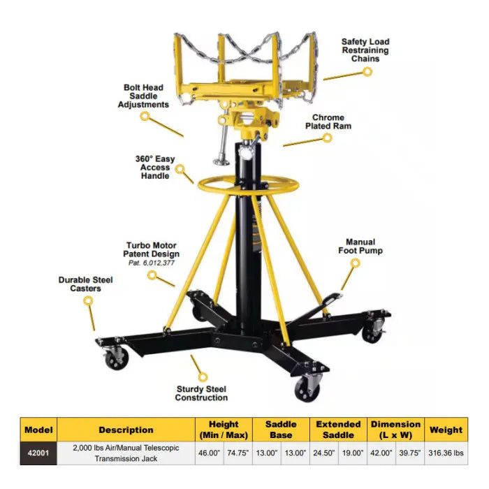 This 1 ton automotive transmission jack is perfect for the typical automotive garage. Features a single stage hydraulic ram that is chrome plated for maximum longevity. Reach maximum lifting height quickly with the aid of the handy foot pedal.Premium air cylinder is only one of the components is just one of the many components that go into making this commercial grade transmission jack. The saddle has an adjustable ratcheting style mechanism for adjusting to most transmission pan configurations. It's compact air turbo motor is even patented (US patent # 5.341.723) It's made to lift the load to the required height quickly, effortlessly and safely. 1 Ton capacity. Roller wheels swivel and glide effortlessly across concrete floors.