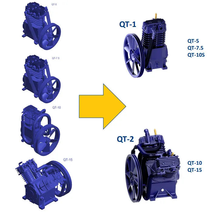 The Quincy QT reciprocating piston air compressor is more than just your typical splash-lubricated two-stage. The highly efficient, robust QT delivers more air (CFM) per brake horsepower while consuming less energy. We use cast-iron where it's needed for strength and durability, and aluminum where it's needed for optimum cooling and long life. A Quincy compressor may cost you a little more up front, but over time, the long lasting performance will save you money.