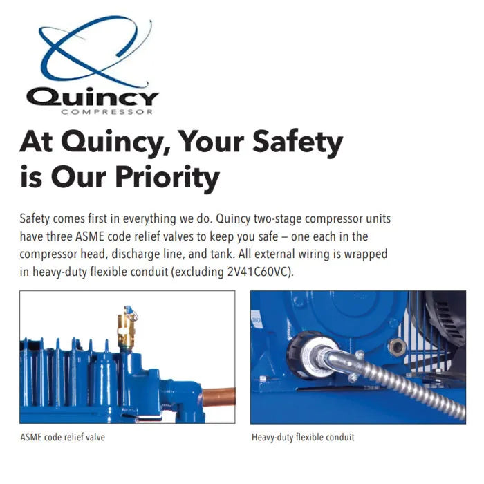 - Quincy packs a one-two punch when comparing components to lower priced compressors. We feature IEC magnetic starters, premium motors, high quality pressure switches, metal automotive style filter/silencers, and a manual ball valve-style tank drain