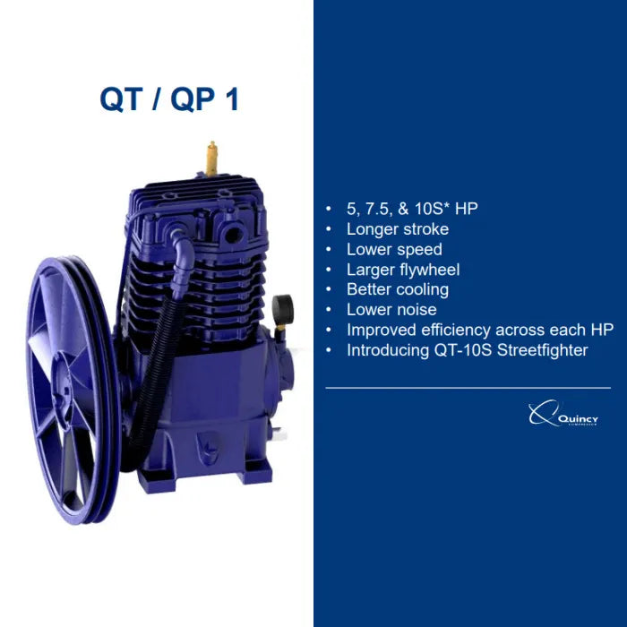 The Quincy QT reciprocating piston air compressor is more than just your typical splash-lubricated two-stage. The highly efficient, robust QT delivers more air (CFM) per brake horsepower while consuming less energy. We use cast-iron where it's needed for strength and durability, and aluminum where it's needed for optimum cooling and long life. A Quincy compressor may cost you a little more up front, but over time, the long lasting performance will save you money.
