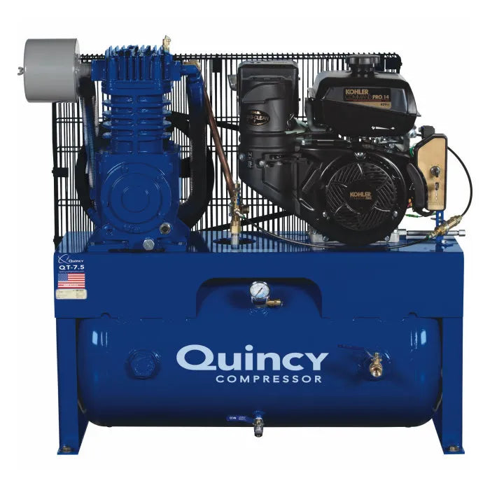 Quincy's QT engine driven models are available with a gasoline Honda or Kohler engine and feature electric and pull start. Battery and cables not included.