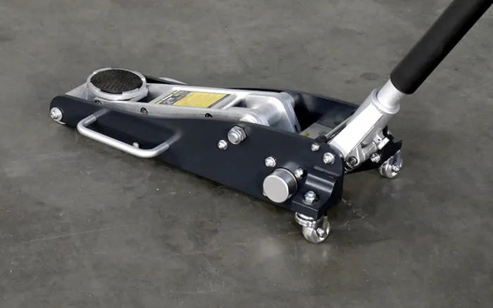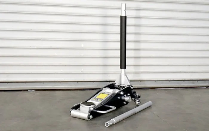 This precision-built jack is constructed from high-strength aluminum and features an extra-low profile for lifting cars with low ground-clearances or side skirts. A fast-action, dual piston quick-pump combined with a rigid knurled aluminum handle gets cars off the ground in seconds. A low-profile single front-roller with wide stance adds stability, and a soft foam handle guard protects against vehicle damage.
