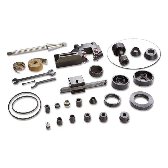 Micro-dial twin tool cutter, boring bar, inside floating adapters, self-aligning spacer, outside floating adapter, centering cones, spacers, double-taper adapters, hubless adapters, carbide cutting tools, 6-sided carbide cutting inserts, 1" arbor, arbor nut, back load spring, spare bulb for lamp, illustrated instruction manual, wrenches, high-impact anti-vibration bands, storage case and more all come standard with a Ranger brake lathe.